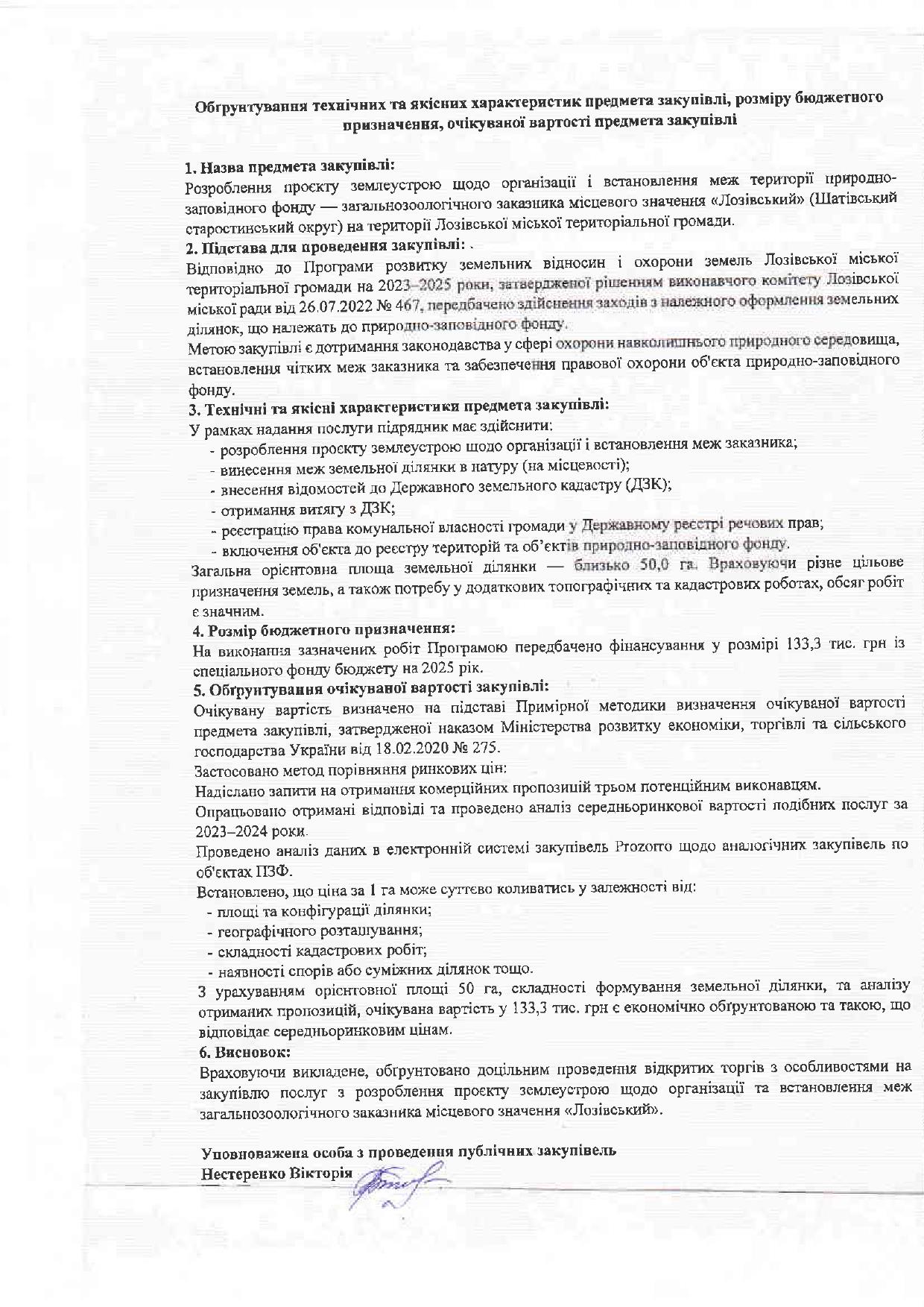 Обґрунтування технічних та якісних характеристик предмета закупівлі, розміру бюджетного призначення, очікуваної вартості предмета закупівлі на розроблення проєкту землеустрою щодо організації і встановлення меж природно-заповідного фонду.