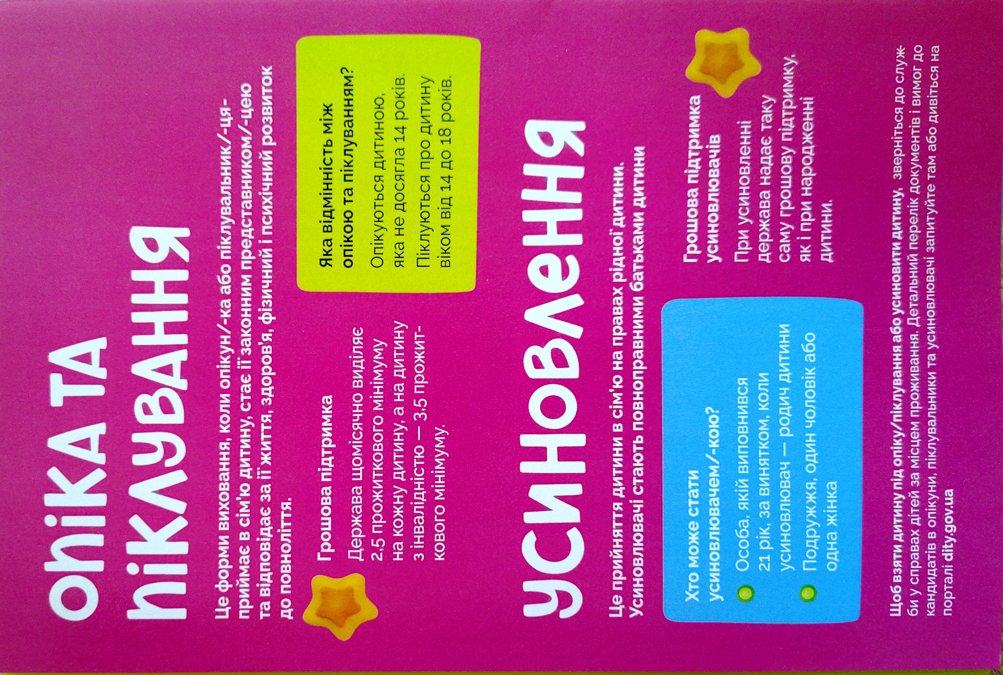 2. Опіка та піклування – призначається над дітьми, які залишилися без батьківського піклування (смерть батьків, позбавлення батьківських прав, довготривала хвороба батьків). Опікуном/піклувальником призначається переважно родич дитини, який стає її законним представником до повноліття. Перевагою є збереження зв’язку з біологічною родиною (у разі можливості).