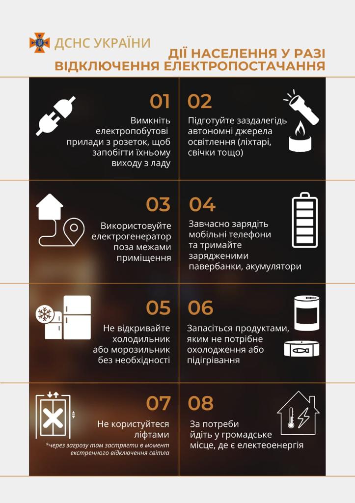 - Не користуйтеся ліфтами (через загрозу там застрягти в момент екстренного відключення світла);
